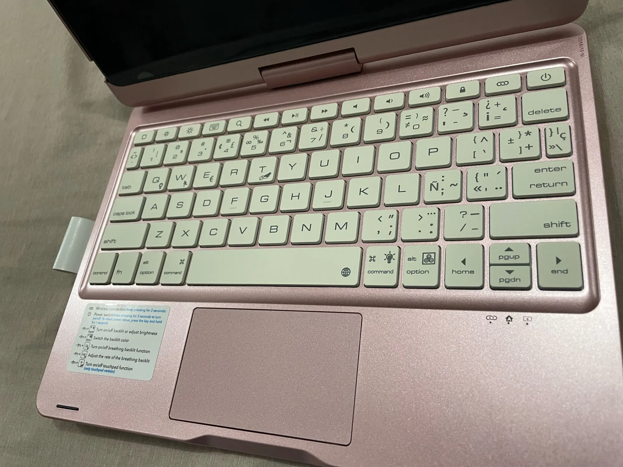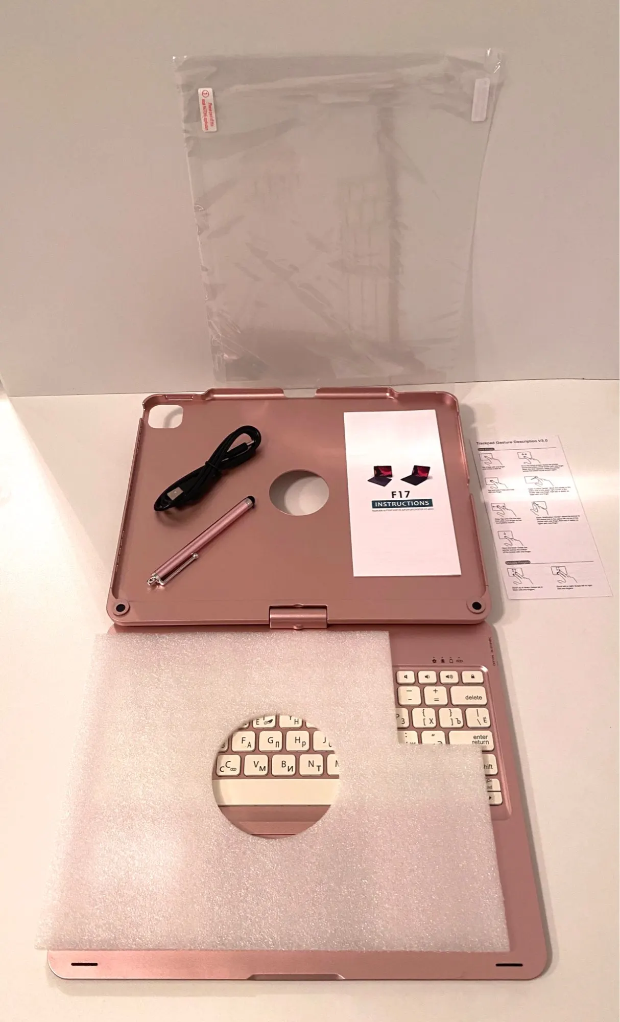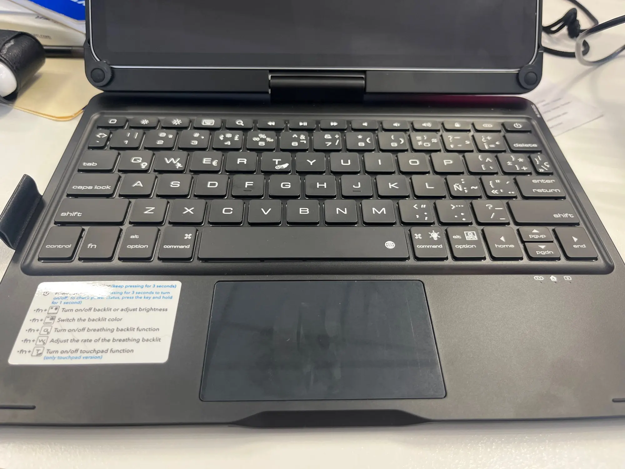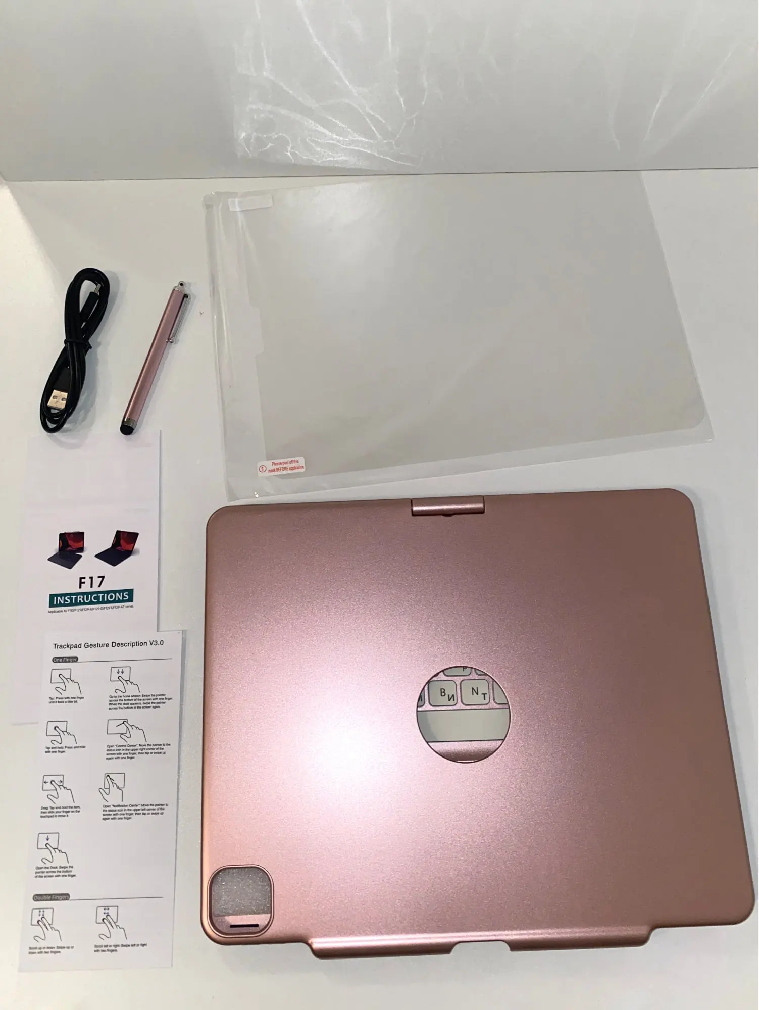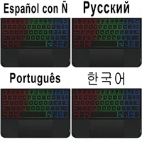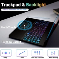 The keyboard comes with a touchpad and supports 3 gesture functions, single finger: click and move the cursor; double finger: selection and page turning; three fingers: switching applications.