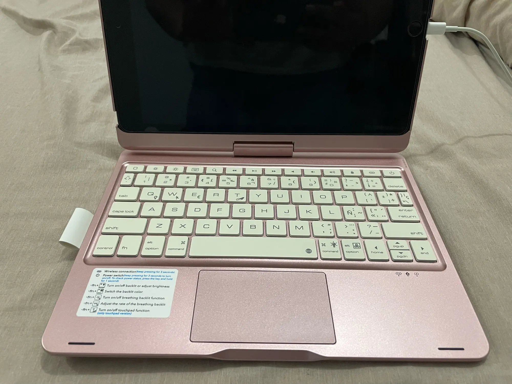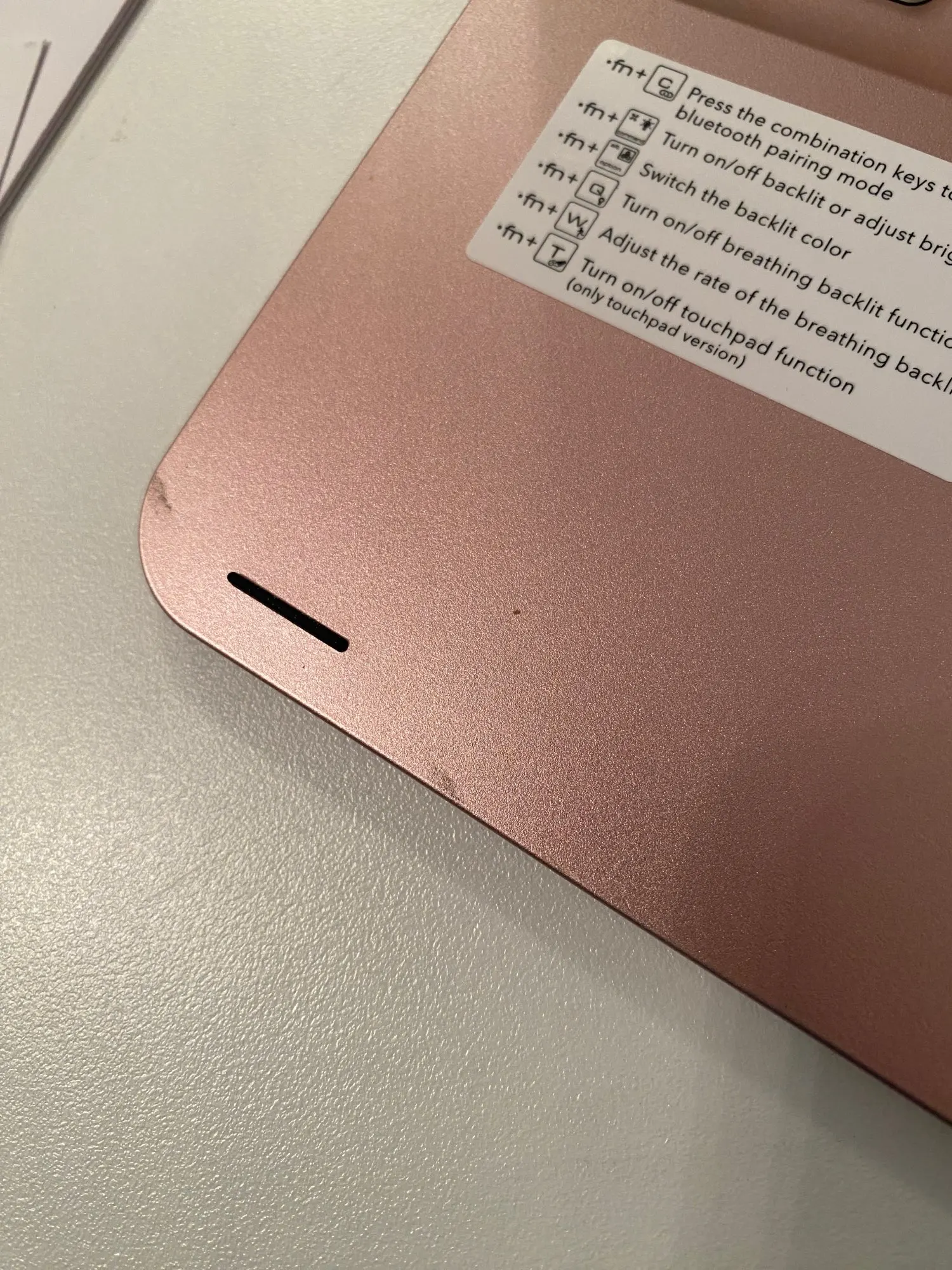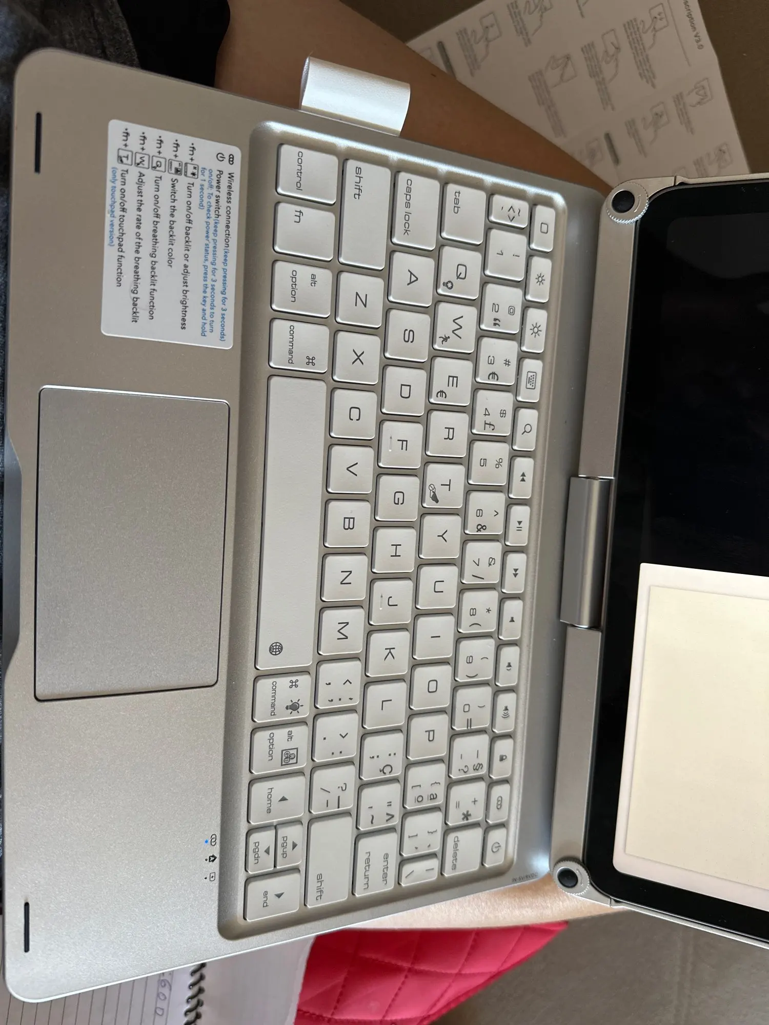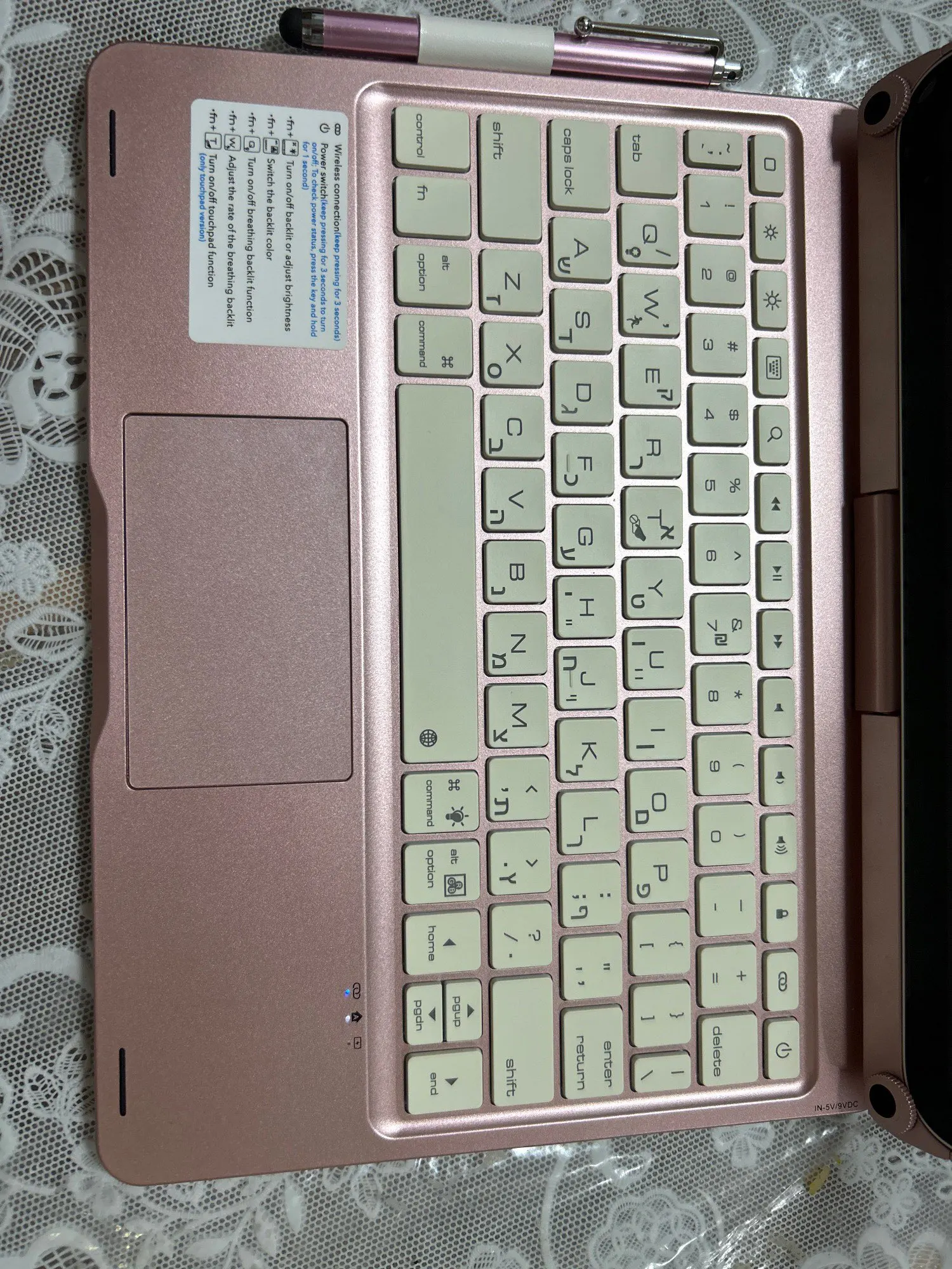 The keyboard comes with a touchpad and supports 3 gesture functions, single finger: click and move the cursor; double finger: selection and page turning; three fingers: switching applications.