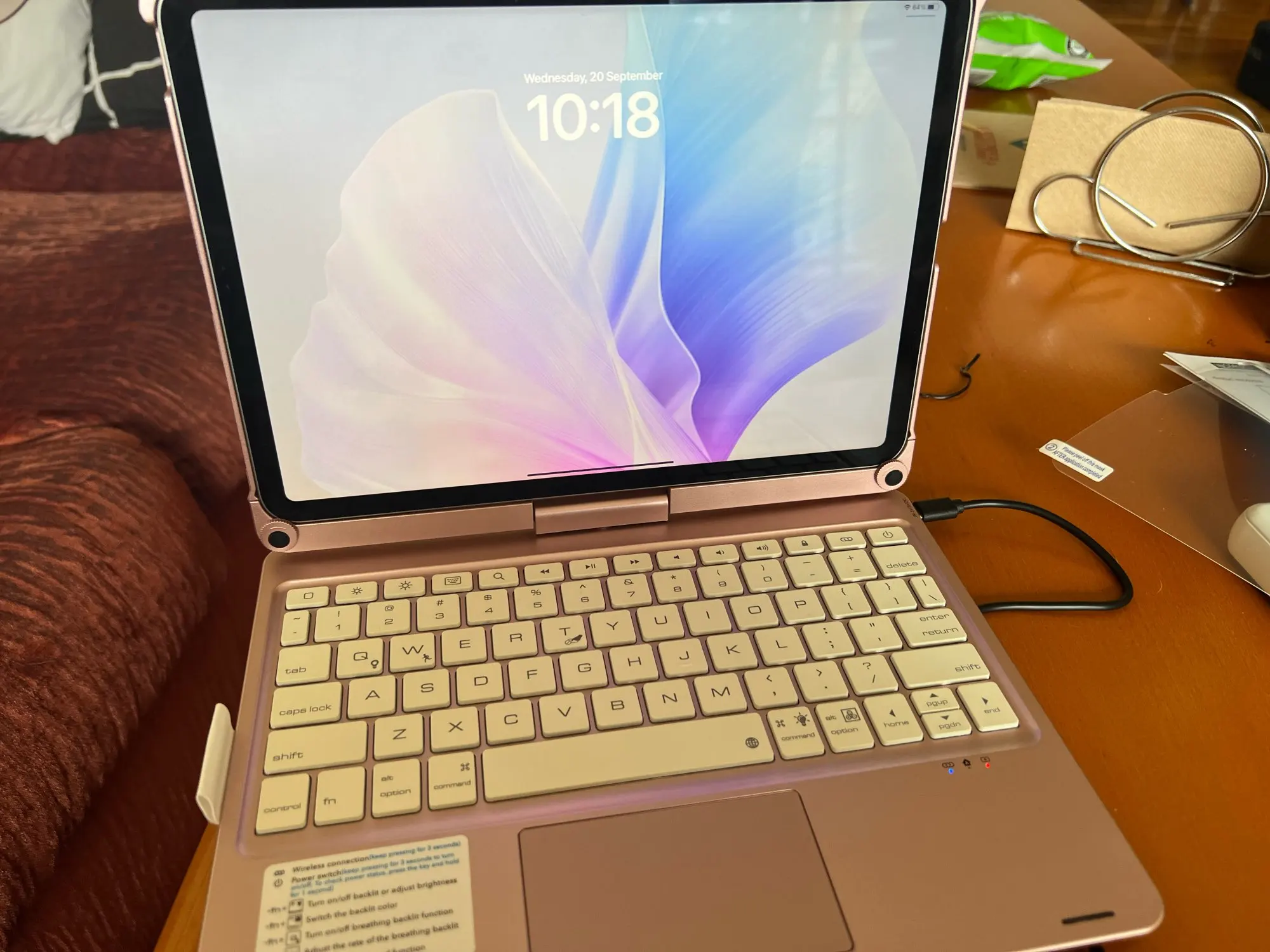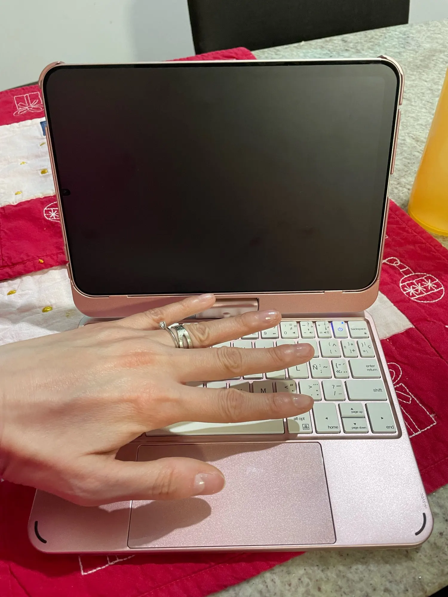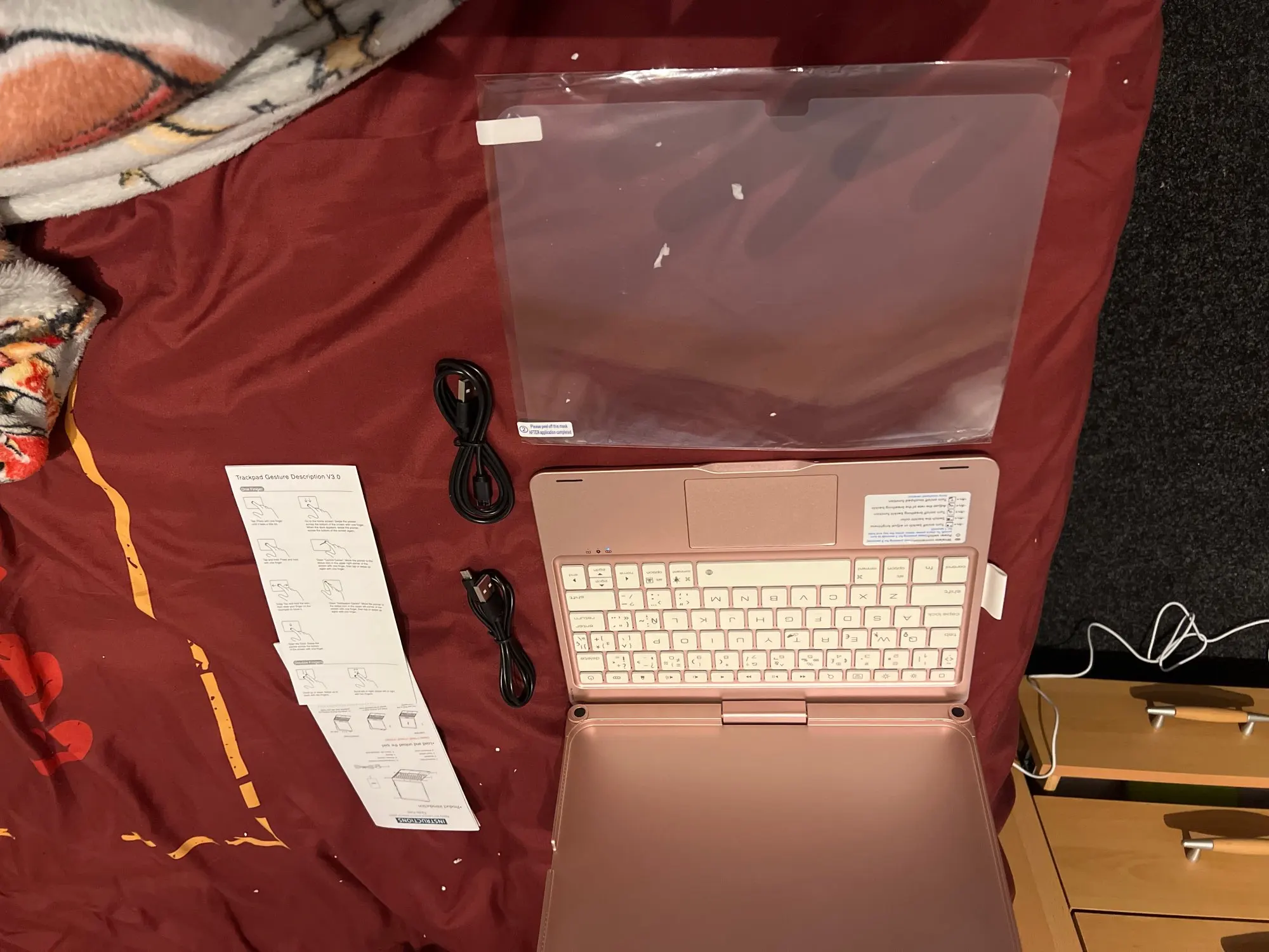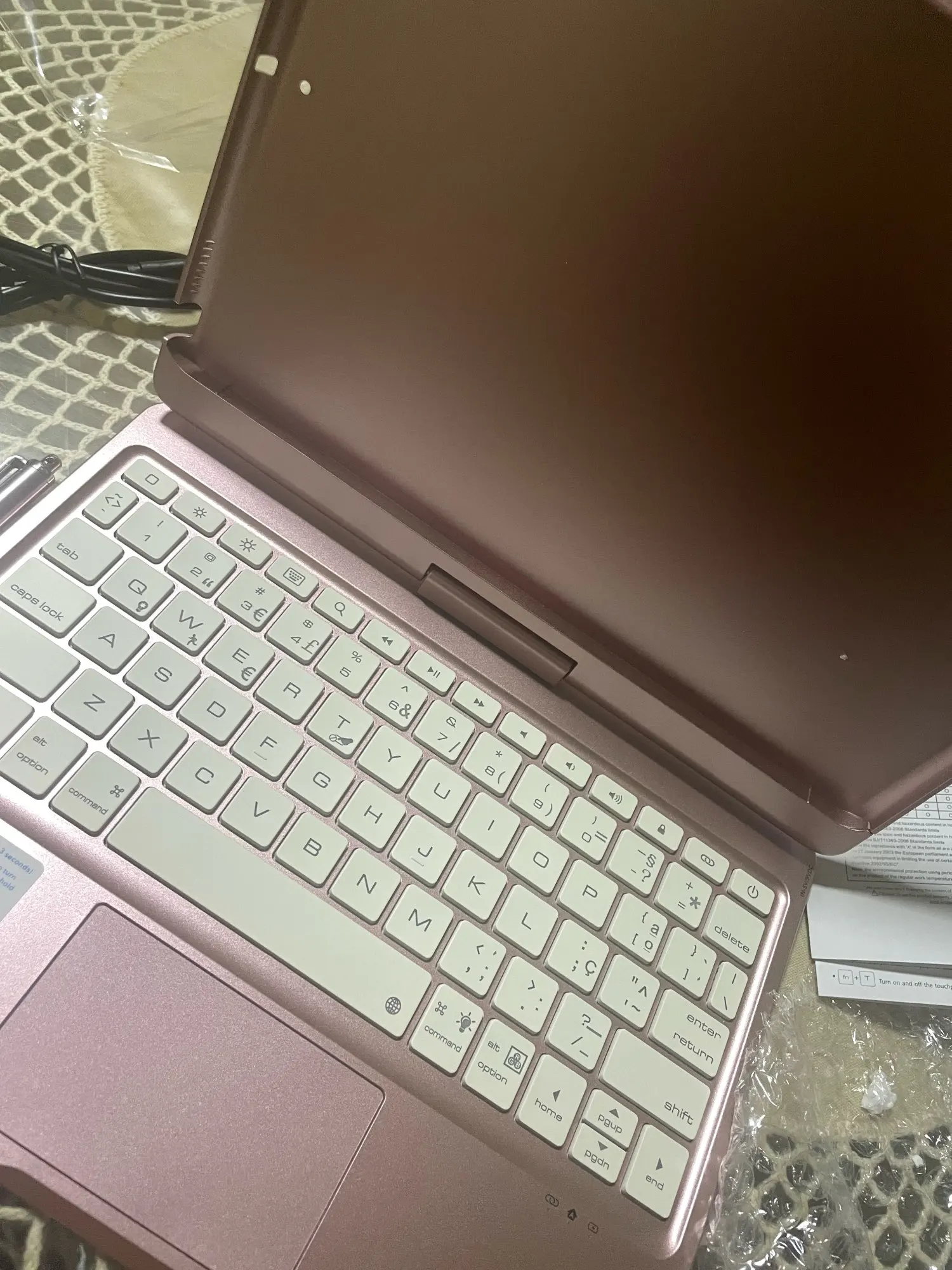 The keyboard comes with a touchpad and supports 3 gesture functions, single finger: click and move the cursor; double finger: selection and page turning; three fingers: switching applications.
