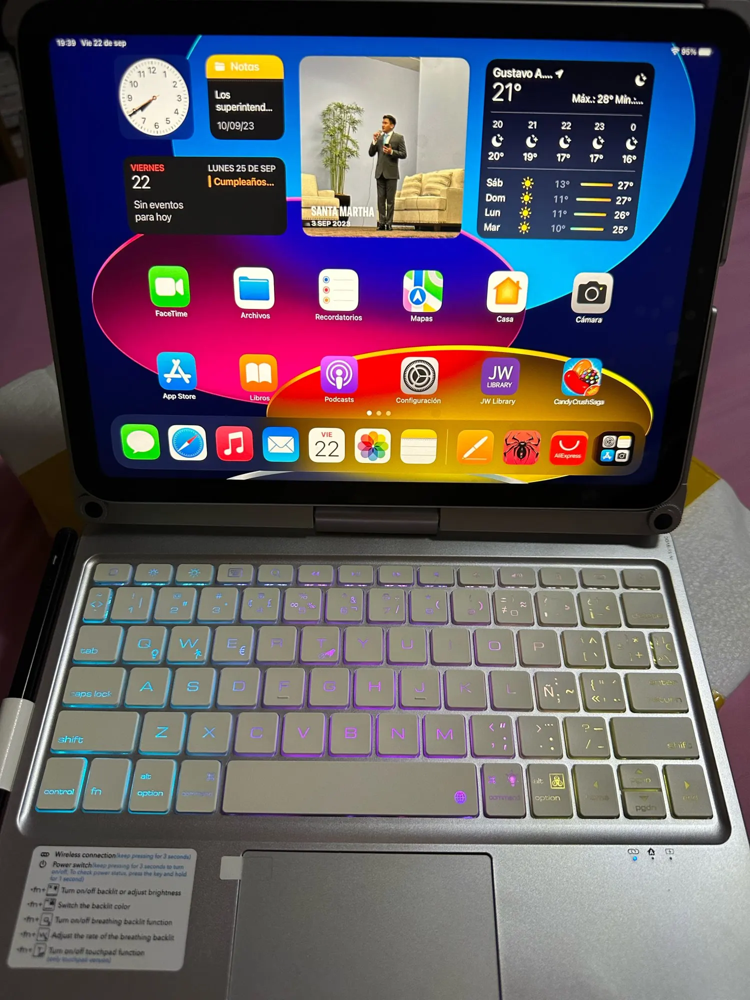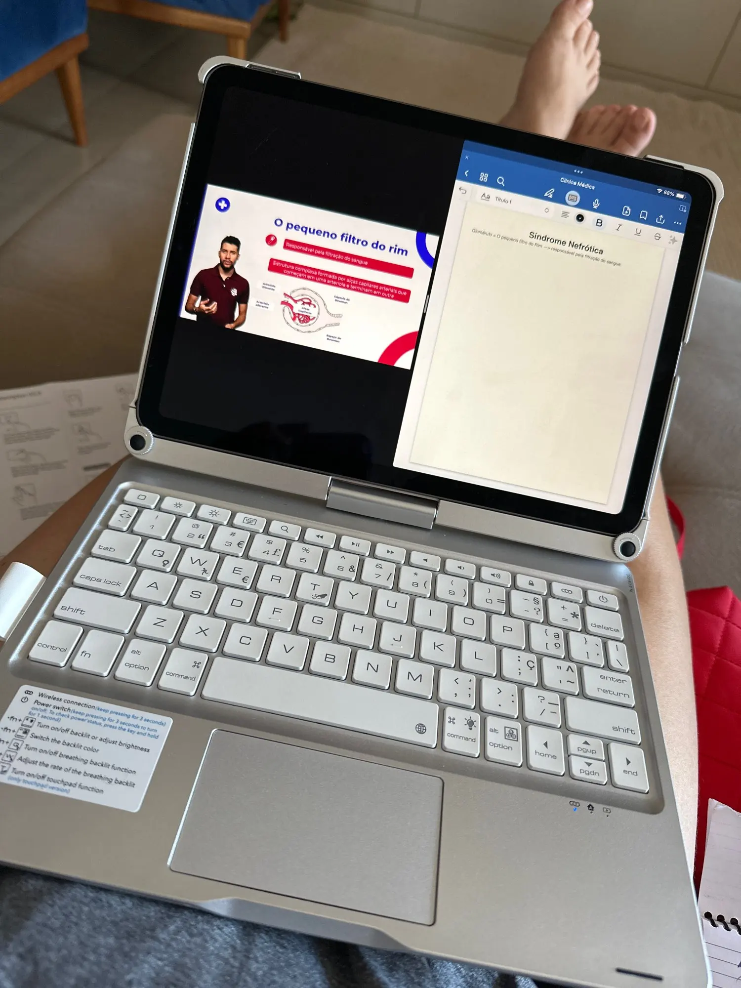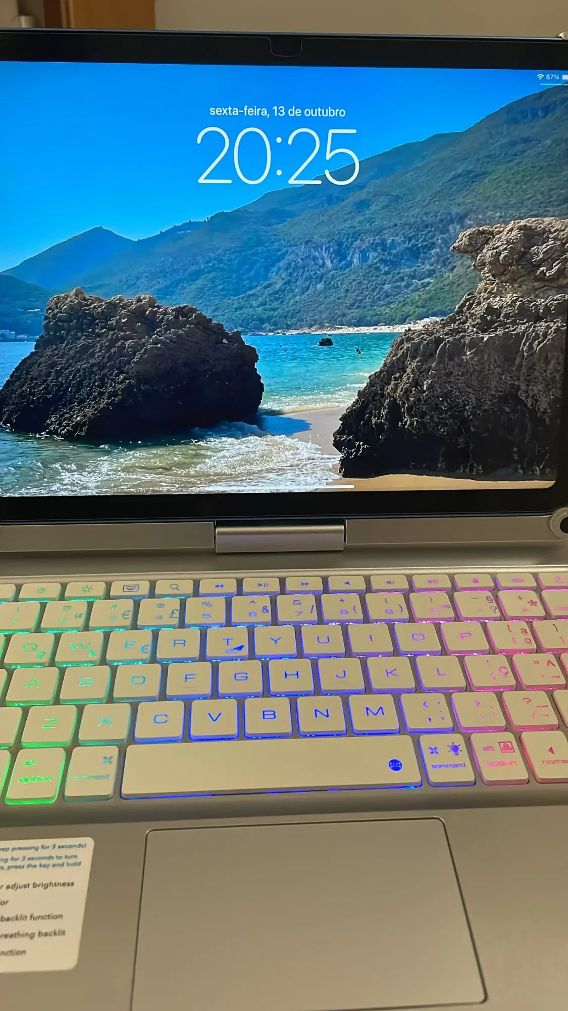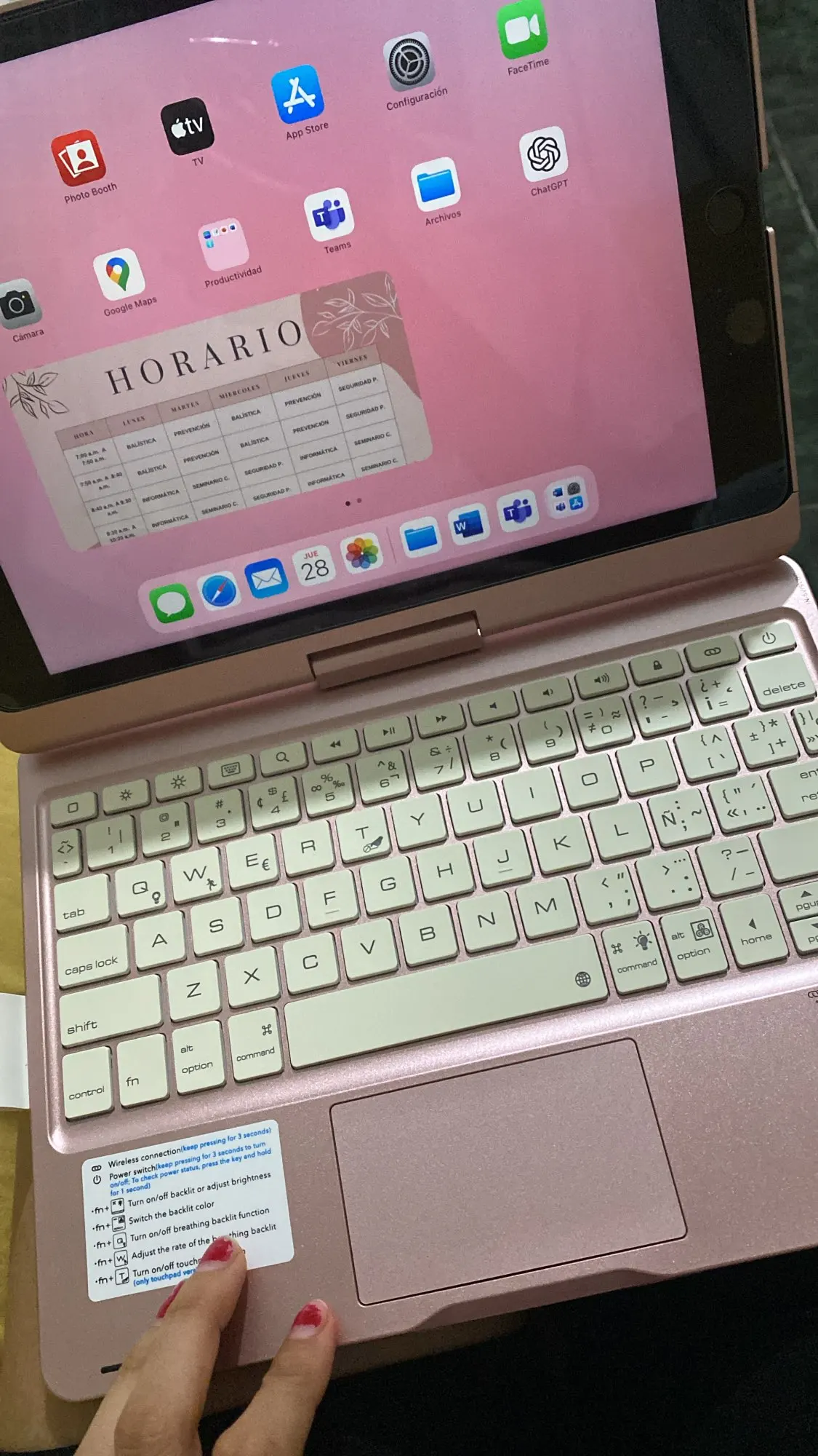 The keyboard comes with a touchpad and supports 3 gesture functions, single finger: click and move the cursor; double finger: selection and page turning; three fingers: switching applications.