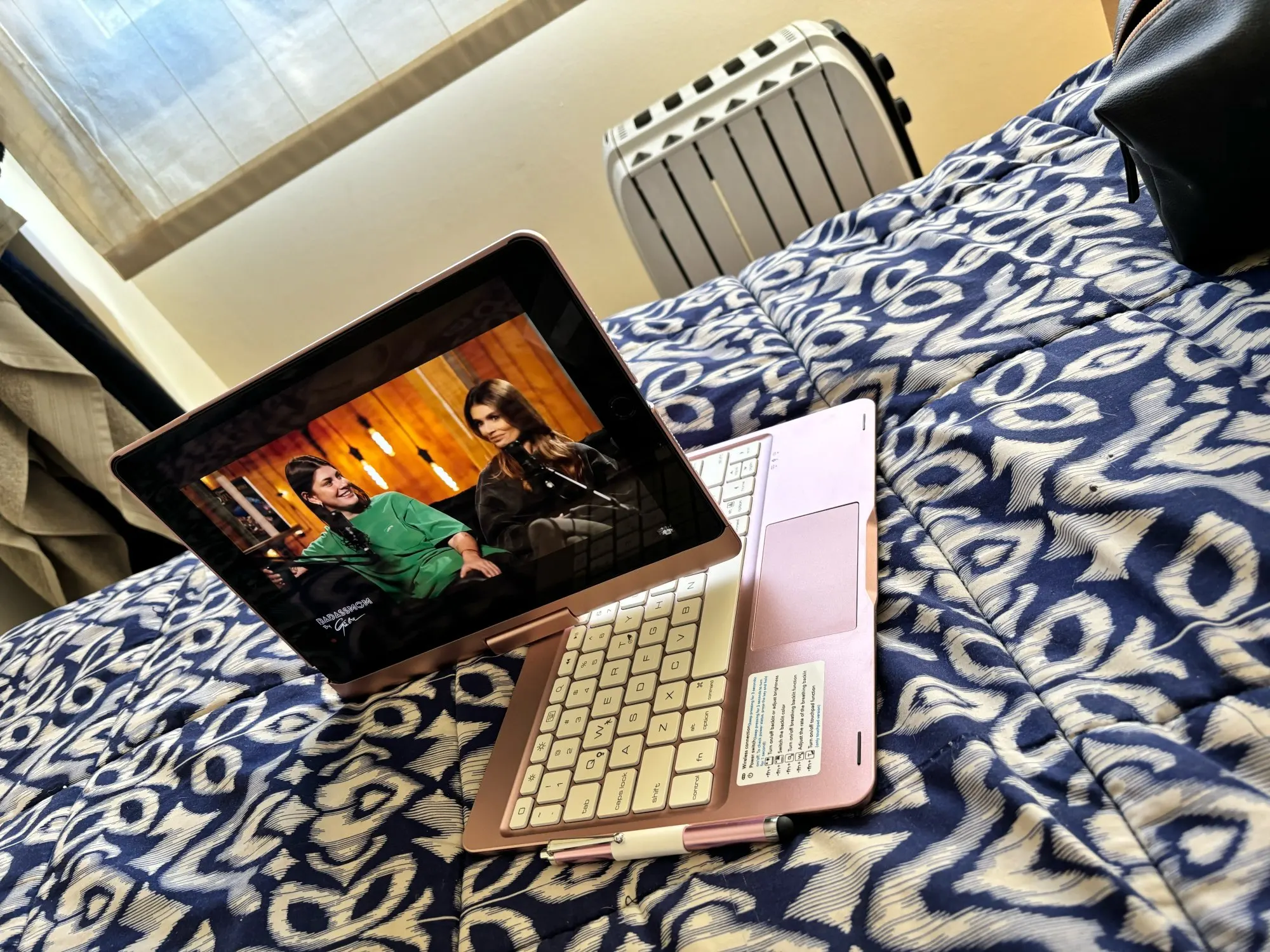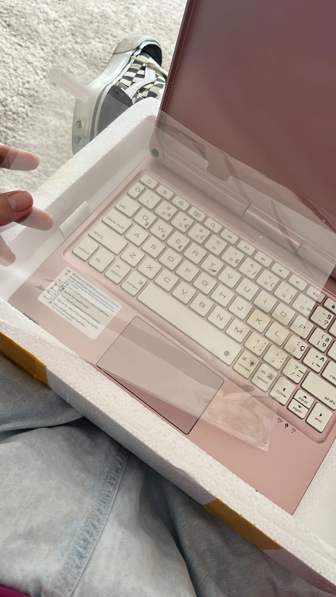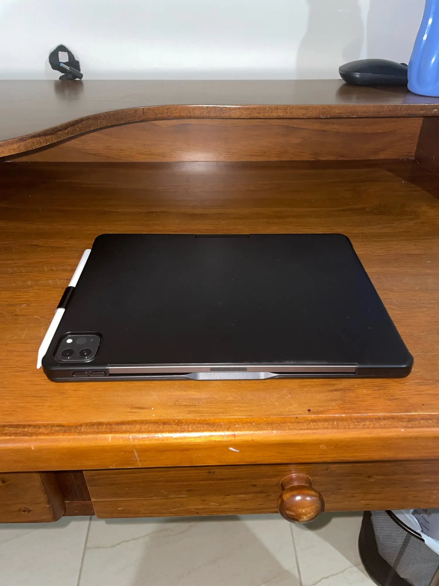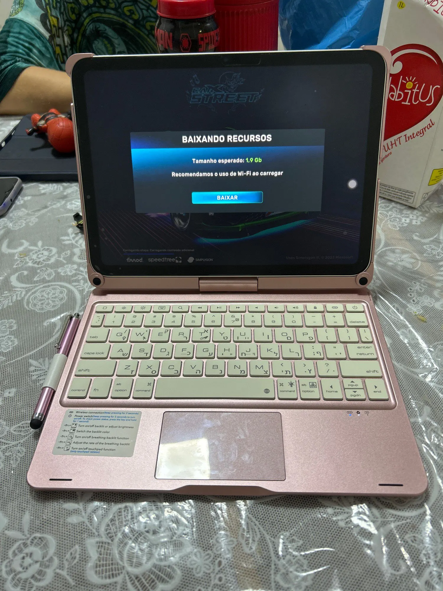 It brings as a gift a screen protector for the iPad and a touch pen.